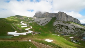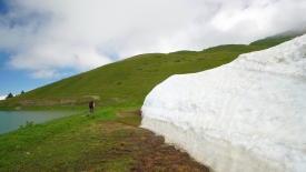 La balade prend alors un ton que je n’avais pas du tout prévu. Au lieu de monter et de nous diriger vers la Tour d’Aï, nous virons sur la gauche, vers une retenue d’eau vraisemblablement utilisée pour alimenter les canons à neige. Il reste quelques névés.