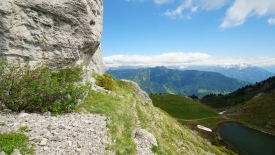 Effectivement, le sentier s’avère être agréable et relativement facile. Il suit fidèlement la falaise et nous fait contourner le lac d’Aï.