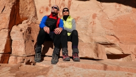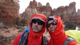 Il nous faudrait 30 minutes de plus pour laisser le temps au soleil de chasser l’ombre. 30 minutes que nous n’avons pas. Nous sommes déjà en retard sur l’horaire prévu. Nous tentons de faire de l’ombre avec nos vestes. Elles ne sont pas assez grandes et le vent, toujours présent, les soulève et les fait danser. Me vient l’idée d’utiliser une couverture de survie. Je sors la mienne du sac et commence à la déplier. Je me rends compte alors qu’elle est complètement inutilisable. Certains des plis restent collés entre eux, tandis que les deux couches qui la composent se détachent l’une de l’autre. J’en fais une grosse boule que je remets dans le sac, prenant soin de ne laisser échapper aucun fragment. Je tire une bonne leçon de l’expérience. Depuis des années, nous trimbalons, l’esprit tranquille, nos couvertures de survie, faisant partie des 10 essentiels qui composent notre fond de sac. Dieu merci, nous n’en n’avons jamais eu besoin car sinon, la déconvenue aurait été de taille. Je me promets d’en acheter deux demain, à Moab et surtout de les vérifier et les changer régulièrement.