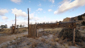 Hier, je vous ai raconté un petit bout de l’histoire de Marie Ogden et de sa colonie Home of Truth. En passant devant, je demande à Stefano de s’arrêter. A notre grande surprise le portail est ouvert et un pickup est garé devant la cabane principale. Ce qui ne m’empêche pas de faire une photo du portail.
