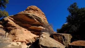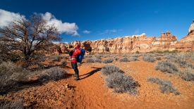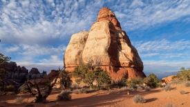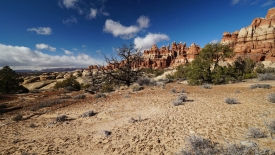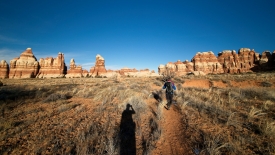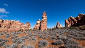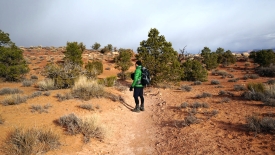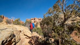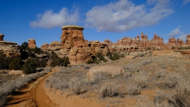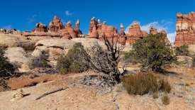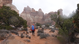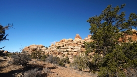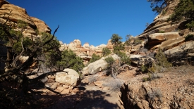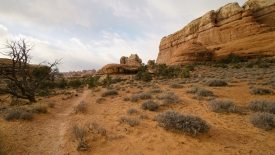 L’itinéraire en lui même est très plaisant et très varié. Vu du ciel, les rochers dans lesquels nous évoluons forment un immense capharnaüm et le sentier zigzague entre les blocs de rochers les plus hauts, se faufilant par des canyons étroits, montant puis descendant. Le vent soulève le sable et nous évoquons notre randonnée d’il y a quelques années, ici même, terminée sous la pluie et le vent, alors que nous nous demandions si nous avions suffisamment arrimée la tente, plantée le matin même à Squaw flat. Rencontré au retour sur le parking, un ranger nous avait rassuré. Nous avions passé deux nuits mémorables. C’était d’ailleurs durant ce séjour que nous avions découvert Salt Creek, Tower ruins et Paul Bunyan’s Potty.