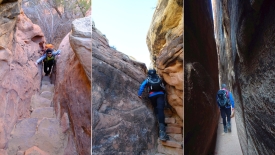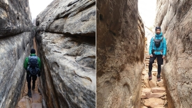 Et bientôt nous voici sur le sentier officiel, le fameux Joint Trail, qui va nous permettre de rejoindre Chesler Park. Le sentier monte d’un niveau, puis de deux, avant de se glisser l’interstice laissé par deux blocs de rocher. A l’arrivée dans la grotte, nous sommes déçus car presque tous les cairns ont disparu. Vient ensuite un long passage étroit, tout droit, entre deux murs hauts de 5 à 6 mètres.