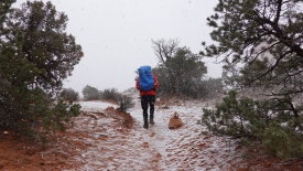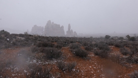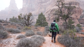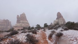 Juste avant d’arriver à Chesler Park, sur le petit raidillon final qui grimpe en zigzag, nous nous collons contre un gros rocher, le temps de protéger les sacs et d’enfiler une Gore-Tex. L’abri offert par le rocher est très relatif et n’empêche pas le vent de nous bousculer ni les flocons de neige de nous piquer le visage. Nous avons nos limites et là, elles semblent atteintes. Les rochers vont devenir glissants, le sable instable et le plaisir de marcher va finir par s’estomper. On rentre ? me demande Stefano. D’ordinaire, j’ai de la peine à renoncer, mais là, la sagesse impose un oui de ma part. En sortant de notre abri, Stefano jette un coup d’œil vers le haut et me dit : on monte quand même juste pour voir ? Il a raison. Il reste deux virages pour parvenir entre deux grandes aiguilles qui marquent l’entrée de Chesler Park.