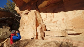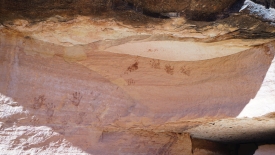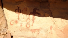 En route pour Chesler Park, pris dans une tempête de neige, nous sommes à deux doigts de rebrousser chemin. Lorsque, en moins de 10 minutes, le temps vire miraculeusement au beau. Du coup, nous faisons le tour de Chelser Park par le Joint Trail et nous offrons une petite escapade pour aller voir un superbe panneau de pictogrammes.