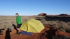 Nous n’attendons même pas que le soleil se couche pour rentrer dans nos quartiers, puis nous nous endormons alors que le vent secoue la tente.