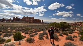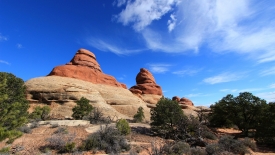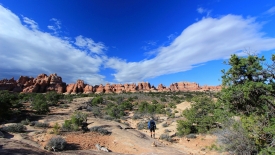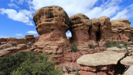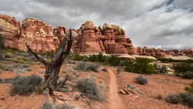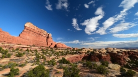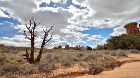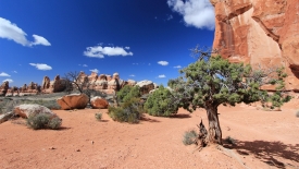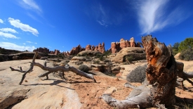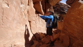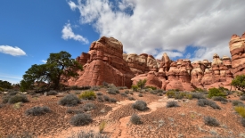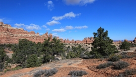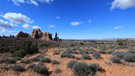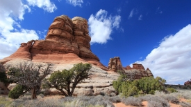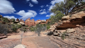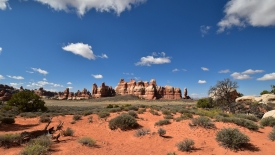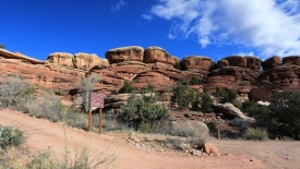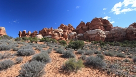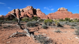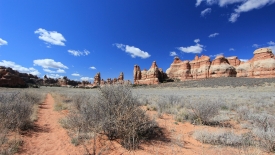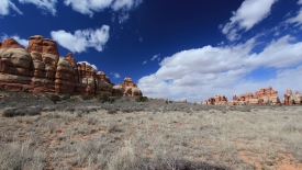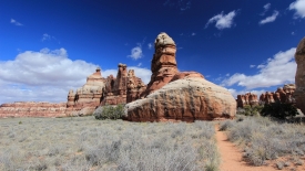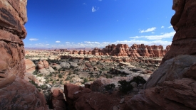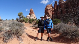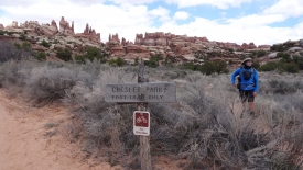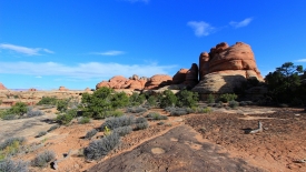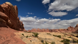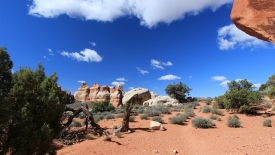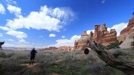 Nous arrivons au wash d’Elephant Canyon et en profitons pour enlever une couche et, puisque nous y sommes, pour manger une Clif Bar. De là, nous avons deux alternatives : suivre le wash en direction de Druid Arch pour bifurquer ensuite vers Chesler Park et y arriver par son côté est ou continuer tout droit pour arriver à Chesler Park par le nord.