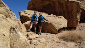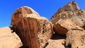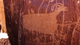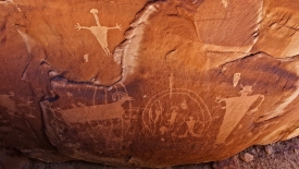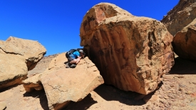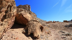 Pourquoi nous sommes-nous arrêtés ? Tout simplement pour un panneau de pétroglyphes. Il est quelque part dans cet amas de rocher, qui, d’ailleurs, vu sous cette angle, ressemble à un dinosaure en train d’agoniser.
