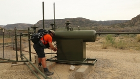Les installations de pompage semblent laissées à l’abandon, bien qu’un bourdonnement émis par l’un des moteurs soit audible. Une porte est ouverte et bat au vent. Dedans, des tuyaux et installations électriques. L’air sent l’huile. Stefano ferme la porte et tente de la bloquer. Nous savons qu’il y a de grandes chances que ces installations ne soient jamais démantelées et qu’elles pourrissent sur place, laissant s’échapper huile et autres produits chimiques.