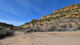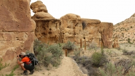 Le BLM a fait un sacré travail de consolidation afin d’éviter que le wash ne sape ce qui reste de la plateforme sableuse, au pied de la falaise. En particulier, les bords du wash ont été renforcé de cailloux enserrés dans du grillage, afin de stabiliser son lit.
