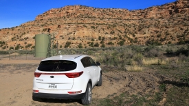 Nous avons repris la voiture et conduit quelques centaines de mètres. Le parking se fait sur le bas-côté de la piste. Le Big Warrior Panel est au centre de la photo, au bas de la falaise.