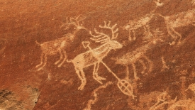 Comment résister à ce que nous pensons être un scène de chasse : des bêtes à corne, probablement du gibier, un chien (en bas, à gauche) et des formes armées de lances ou peut-être d’arcs.