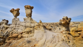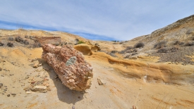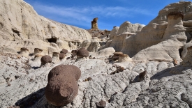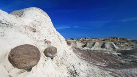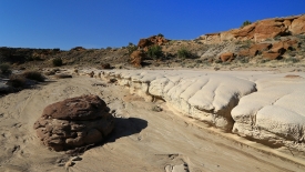 Encore partiellement emprisonnés dans ces dunes de sable blancs, des boulets tout ronds émergent. Ce ne sont pas des hoodoos en devenir. Une fois libérés, ils vont tout simplement rouler au bas de la pente et rejoindre leurs prédécesseurs.