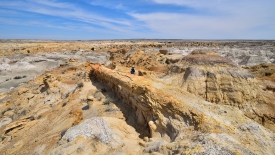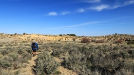 La marche d’approche est courte, quelques dizaines de minutes. Il nous faut atteindre le bord de la dépression, au fond de laquelle se trouve De-Na-Zin et ses formations géologiques hors du commun.