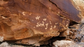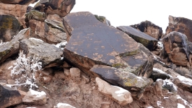 Stefano a un POI qui se trouve le long de la Highway 128, au mile marker 31. Il s’agit d’un bloc de rocher recouvert d’une cinquantaine pétroglyphes. A nouveau, nous jouons aux parfaits touristes avec une photo prise de la voiture.