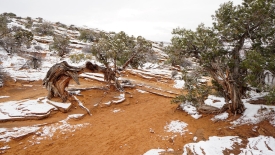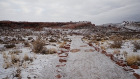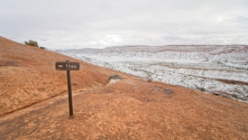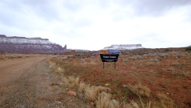 Nous prenons la route pour Grand Junction. Le temps se dégrade. Notre arrêt planifié à Fisher Tower se résume à une photo, prise depuis la voiture. Il neige, il vente, et le dos et les fesses bien confortablement collés aux sièges chauffants n’ont pas très envie de sentir la froidure extérieure. Nous notons et apprécions néanmoins le magnifique panneau.