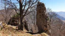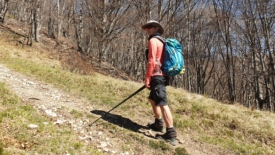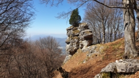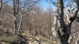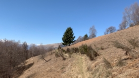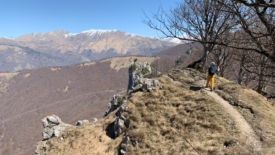 Le sentier est véritablement posé sur la crête. D’un côté, côté Suisse, une pente abrupte, parfois herbeuse, parfois rocailleuse. Du côté italien, des hêtres, majoritairement.