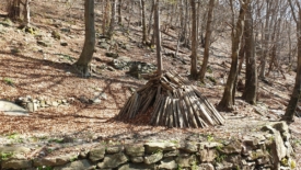 Une « place à charbon » reconstituée. Pourquoi ici en pleine forêt ? Tout simplement pour une raison de densité : le charbon de bois est moins lourd à transporter que le bois.