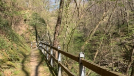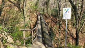Au bout de cette piste, nous rejoignons la route qui dessert tous les petits villages aperçus depuis la crête des Denti della Vecchia. Stefano me propose – sans garantie – un itinéraire pour nous éloigner des rubans bitumineux. Il commence par enjamber une, puis deux clôtures pour descendre ensuite, via une volée d’escalier étroite, vers une retenue d’eau interrompant le courant d’un torrent. Les marches, peu profondes et rapprochées, s’enchaînent rapidement. La main courante, faite de barres de bois, sécurise la descente.