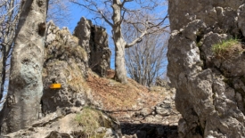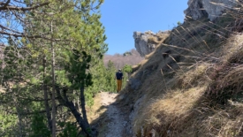 C’est sans doute pour cela que nous voyons de multiples sentes se détacher fréquemment du sentier principal. Aucune voie d’escalade n’est indiquée et seuls quelques reflets brillants de mousquetons accrochés aux parois trahissent l’aménagement des voies.