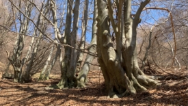 En quittant la cabane, le sentier remonte légèrement avant la descente dans la forêt de hêtres.