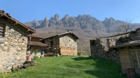 Du petit hameau de Pönt, nous pouvons apprécier la longueur de la crête des Denti della Vecchia. Nous sommes partis de tout à droite pour arriver tout à gauche.