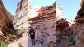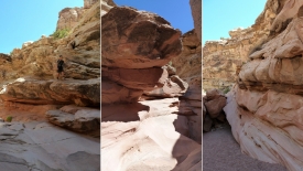 Nous sortons du slot (1) (2). Le reste, c’est de la balade qui consiste à suivre les méandres du wash, sans se presser, en appréciant le paysage (3).