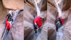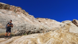 4 ou 5 passages de down scrambling où il faut descendre les sacs avec la corde car nous passons les pour-off dos contre un côté de la paroi et pieds de l’autre.