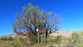 Deux voitures sont garés, en hauteur, à l’ombre de cottonwoods.