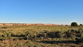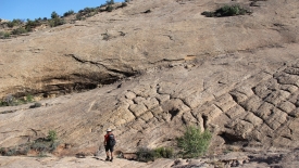 Nous rentrons petit à petit dans le canyon et retrouvons le slick rock. Derrière moi, le Butler Wash et sa plaine.