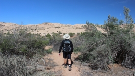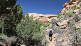Du slick rock, nous sommes repartis dans la végétation, dans le lit d’un wash perpendiculaire au Butler Wash.