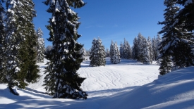 Le retour vers le Chalet Neuf se fait de manière beaucoup plus directe. La pente est faible (heureusement) et il suffit de pousser un peu sur les bâtons pour avancer sans effort. Nous descendons jusqu’à La Bucheronne avant de remonter vers le Pré d’Aubonne.