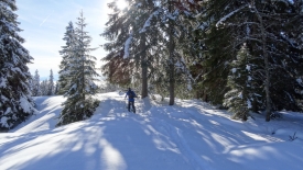 Après quelques centaines de mètres, nous attrapons un sentier qui va nous ramener vers Les Monts de Bière Devant. Theoritically, dirait Schwarzy dans son rôle de Terminator. Stefano m’annonce une montée, montée que nous avons tout le temps de savourer et où les peaux n’auraient pas apporté une grande aide. Lorsque la densité de sapins nous interdit des traversées, nous n’avons d’autre choix que d’utiliser les techniques dites de monter en canard ou en escalier.