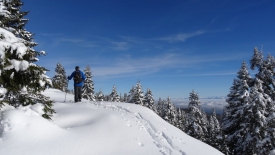 Nos doutes sont confirmés : les skis sont beaucoup moins maniables que les raquettes et même avec les peaux certains endroits restent impraticables. Nos raquettes ont encore de beaux jours devant elles : nous n’allons pas les abandonner. Comme nous l’avions expérimenté l’année passée, au terme de trois sorties consécutives en raquette, les petits bobos commencent à s’installer. L’alternance avec les skis devrait permettre de les soulager.