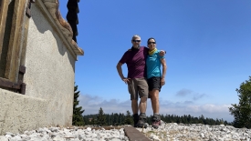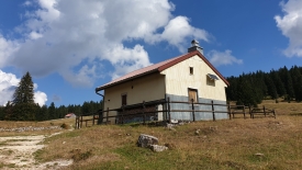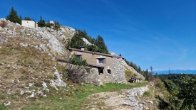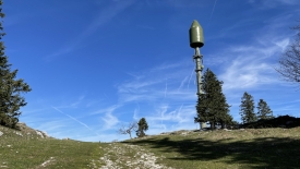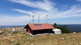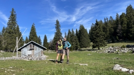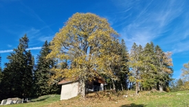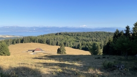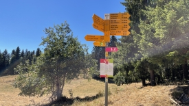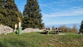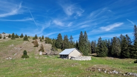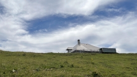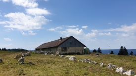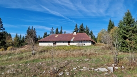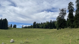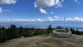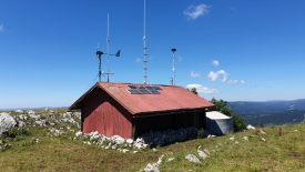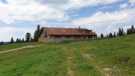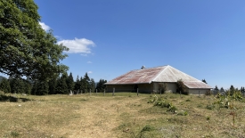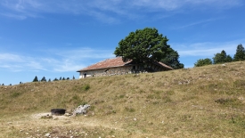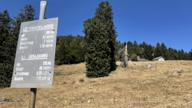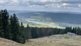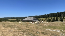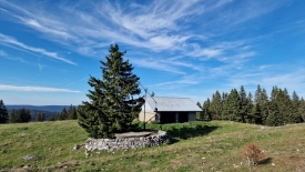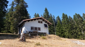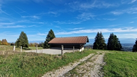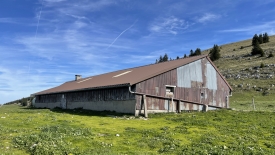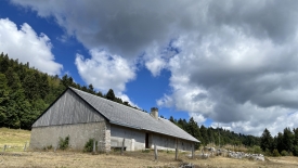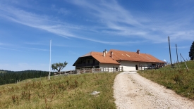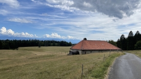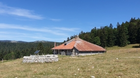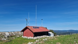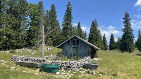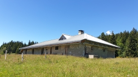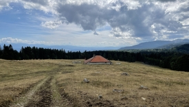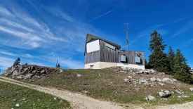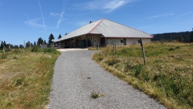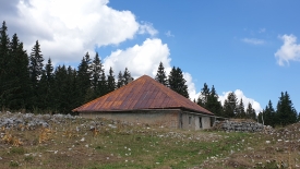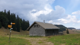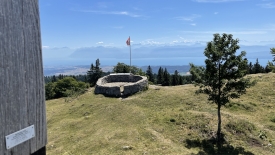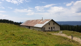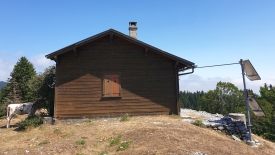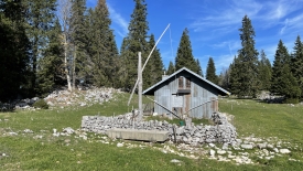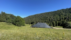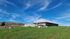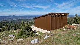 Nous arrivons au sommet du Mont Tendre un peu avant 14h. Alors que nous profitons du panorama, tant côté Alpes que côté vallée de Joux, nous remarquons, en contrebas, sur la même ligne que le chalet de Yens, ce qui, de loin, pourrait ressembler à un petit refuge flambant neuf. Ni une ni deux, nous descendons tout droit dans le pré pour satisfaire notre curiosité.