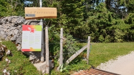 Panneau tout neuf indiquant La Perrausaz accompagné d’un rappel concernant l’attitude du bétail, stressé par la présence du loup. Nous avons pu en faire l’expérience il y a quelques semaines, quand, au pâturage des Loges, nous avons été confrontés à une vache aggressive qui nous a chargés.