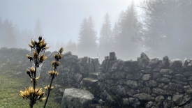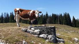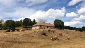Petit passage à La Neuve avant de suivre le sentier qui va au col du Marchairuz. Nous le laissons pour descendre vers la route qui, l’hiver, se transforme en piste de ski de fond. Des hauts-savoyards sont en train de pique-niquer sur une route en terre battue. La cabane de l’Ecureuil n’est pas loin et nous leur comptons l’histoire de ce jeune juif blessé, égaré, qui s’était réfugié dans cette cabane où de bons samaritains l’avaient soigné puis caché en Suisse. Retrouvé il y a quelques années, il avait été invité ici même pour la commémoration de cet événement. Elle me dit que nos mots lui donnent de la chair de poule.