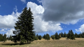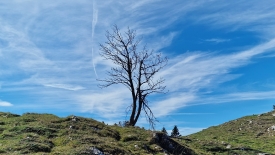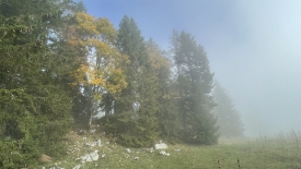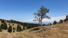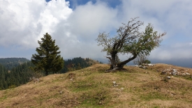 La cabane des Rochers est ouverte, repoussant notre arrêt déjeuner. Le sommet du Mont Tendre étant trop éloigné, la pause se fait aux Rochettes, près de notre arbre à thé qui a perdu encore quelques branches cet été. Nous nous installons un peu en contrebas, tentant de nous abriter du vent qui souffle sans relâche.