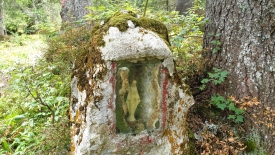 Arrivés à l’endroit où une vache agressive m’avait presque forcée à prendre un bain dans une mare, nous attrapons le sentier de la Vierge des Begnines, plus connu semble-t-il par le nom sentier des Croix rouges. C’est en tout cas ce qui est écrit sur le ski de fond, solidement vissé sur le tronc.
