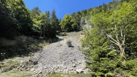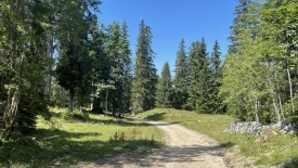 Le sentier se rétrécit encore, puis attaque dans la pente un ancien pâturage avant de rejoindre la piste qui monte du pré de St-Livres.