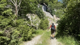 Hier, je me suis fait une méchante ampoule au talon. Allez savoir pourquoi ? Est-ce la combinaison chaussette-chaussure ? Ou la chaleur ? – Mince, je viens d’en reparler une seconde fois -. Alors aujourd’hui, j’ai choisi de garder mes chaussures de tous les jours, mes Keens Newport II. Elles sont assez bien classées en tant que sandales de trekking. Mais j’ai laissé de la poussière, de la terre et des petits cailloux s’accumuler et la plante de pied s’est un peu échauffée. Du coup, pour atténuer le frottement, je demande à Stefano de rentrer par la route.