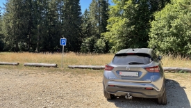 Le brouillard s’est installé et la cime des arbres se perd dans le gris alors que nous roulons vers le parking de La Bassine. Le temps maussade n’a pas découragé les campeurs et les VW California sont en grande majorité, voire exclusivité. Des familles entières se promènent sur la route. Quel succès !