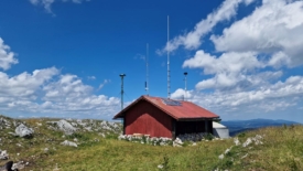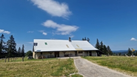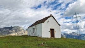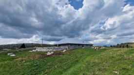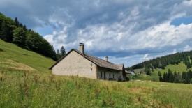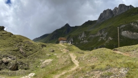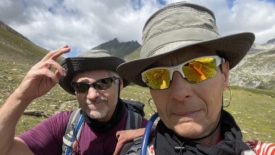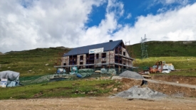 De loin, à proximité du col, nous apercevons un bâtiment – encore en construction – qui n’était pas là l’année passée. Un refuge à cheval sur la frontière, pour attirer les touristes.