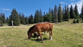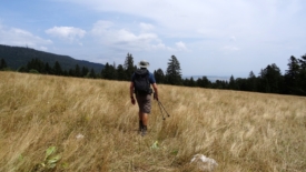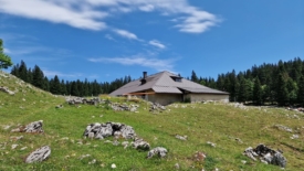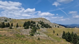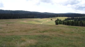 Arrivés au chalet du Croue, nous partons vers le crêt des Danses pour avoir une vue sur le creux du Croue et l’éventuel troupeau de moutons qui serait accompagné de patous.