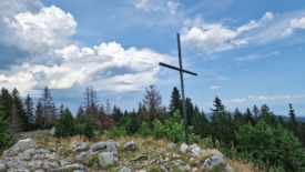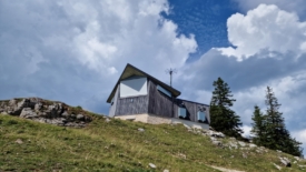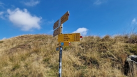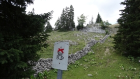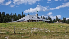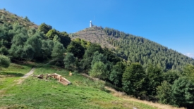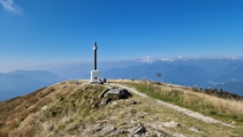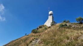 La montée finale vers le radôme et la croix se fait par un sentier consolidé à grands coups de marches de pierre et de traverses de rails. Au son d’un cor des Alpes.