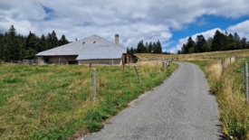 A l’intersection de la route qui descend des monts de Bière devant, quantité de voitures sont garées. Le lieu est touristique. Nous suivons la route sagement, préférant ne pas traverser les prés réservés au bétail l’été. Les vaches sont plutôt en lisière de forêt, à la recherche d’ombre et d’herbe qui ne ressemble pas à de la paille séchée sur pied.