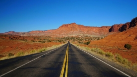 Nous passons Caineville et longeons la Fremont River, celle-là même qui a permis le développement des vergers de Fruita. Sur notre gauche, des badlands à perte de vue, constitués des dunes de sable blanc, acérées, qui ressemblent à des ailerons de requins.