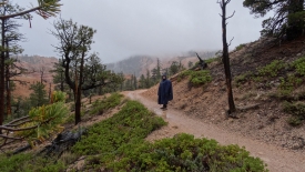 Nous papotons quelques minutes avec un hiker et nous évoquons le mauvais temps. Il conclut : this should never happen on the Fairyland Trail! Pas faux !