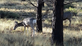 Sur la route, des petites bichettes paissent au milieu des troncs calcinés de Ponderosa pines.