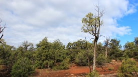 Ciel bleu (enfin, presque), fiu-fiu jaunes, terre rouge foncée car mouillée, arbre mort, pins… Tous les ingrédients sont là !