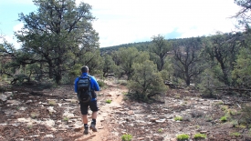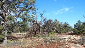 Nous marchons sur la mesa et devrions arriver à l’entrée du canyon dans quelques minutes. Road Canyon, pour mémoire, c’est le canyon dans lequel se trouvent les Seven kivas. Nous étions allés les voir en 2011 (voir le billet Road Canyon). Lorsque nous étions allés à The Citadel, l’année passée, nous avions longé ce canyon par le haut et avions pu voir d’ailleurs, de très loin, les Seven Kivas.